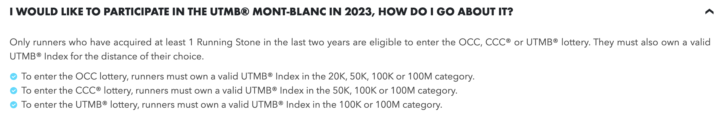 しかしUTMB worldのホームページのFAQに参加方法の事が載っていまして、2023年からはこのポイント制は廃止され、2020年の参加資格から移行する人でも100km以上UTMB Indexが必要だと思っていたのですがどうなんでしょうか?日本だと今年度を例に挙げると彩の国やみなかみトレイル、ビワ100位しか該当しないのかな?と思いまして。