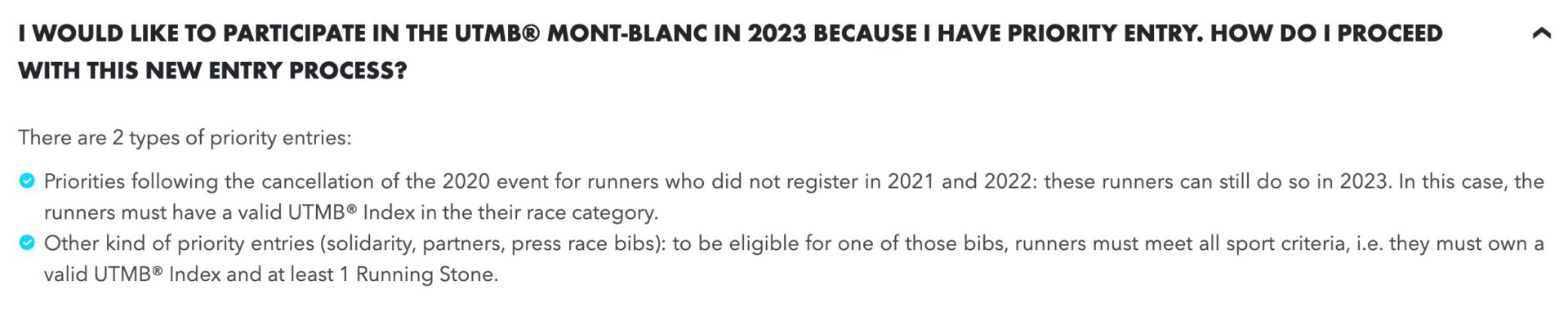 Priorities following the cancellation of the 2020 event for runners who did not register in 2021 and 2022: these runners can still do so in 2023. In this case, the runners must have a valid UTMB® Index in the their race category.
